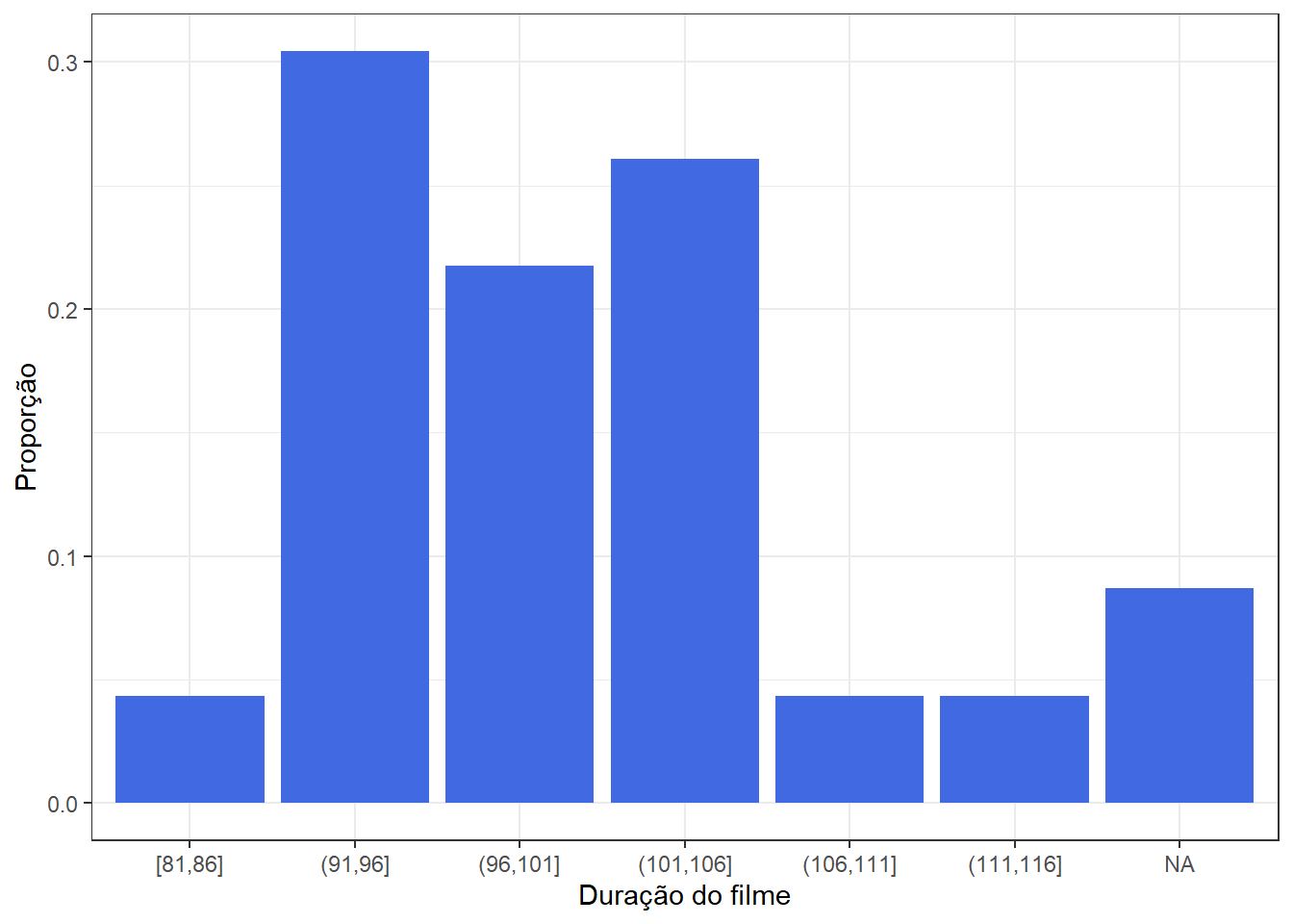 ggplot() + theme_bw() + xlab("Duração do filme") + ylab("Proporção") +